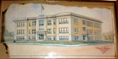 When the Mayor got no answer on calling the store, he called Lee’s home. Lee said he was down with the flu, but that after a while, his wife would be out and he could sneak down to the store and see what he could find. The next day Lee called the Mayor back. “I’ve found a drawing of the school,” he said. “It’s drawn in perspective, its landscaped, the flag is flying and there are kids walking around. Do you want to come over and see it?” “I sure do”, said the Mayor. It didn’t sound like it would be much help in showing structural detail, but a visit with Lee was always more than worth the time spent.